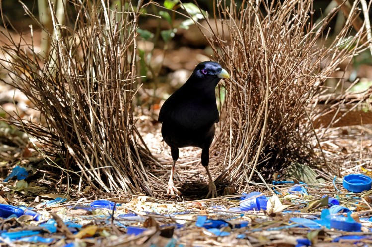So collecting all the blue stuff has therefore been driven by sexual selection, with strong evolutionary pressure due to female choice. Females only mate with males whose bowers are sufficiently impressive, based on their own preferences (we think that because blue items are quite rare in nature, this is a good proxy for a male’s quality). There’s also evolutionary pressure for males to compete with each other – males steal decorations from one another and trash each others’ bowers so that their own display appears comparatively better to the discerning females. Check out this video from the Borgia Lab of a male absolutely going to town to destroy a rival’s bower, and watch all the way to the end when you see him stuff his beak with stolen decorations!